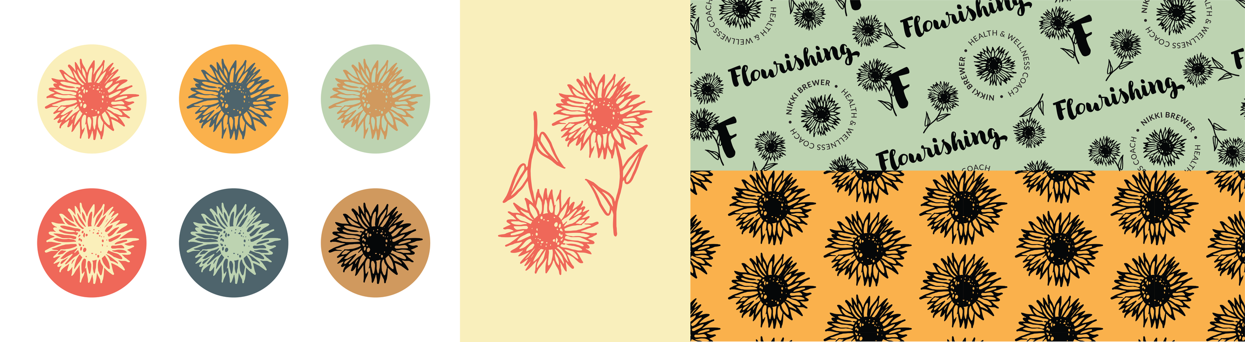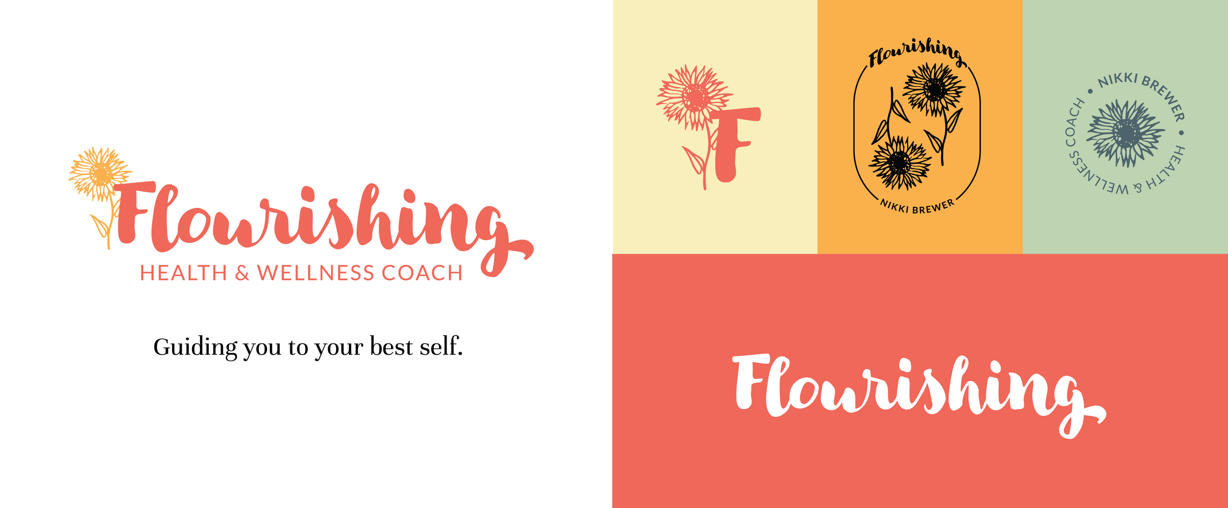 Flourishing's primary logomark was carefully crafted to embody the concepts of ‘beauty in imperfection’ and ‘wisdom in growth,’ capturing an organic and natural aesthetic that resonates deeply with the brand’s values. This design reflects Nikki Brewer's commitment to guiding clients toward balanced and fulfilling lives. Complementary secondary marks were developed to maintain brand recognition while enhancing versatility and readability across various platforms. These streamlined versions of the primary logo ensure that the brand remains consistent and impactful, whether in print or digital media, adapting seamlessly to different sizes and applications.