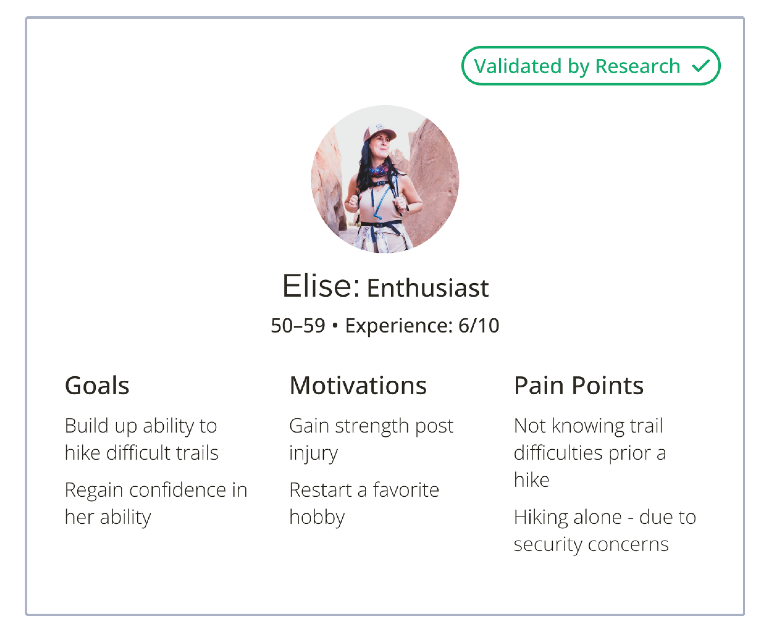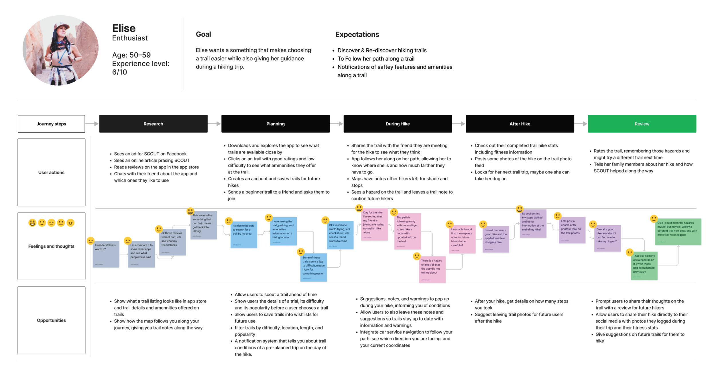 After our personas were validated, we then utilized them to map out customer journeys. This allowed us to understand how a hiker might utilize our product to complete their goals.